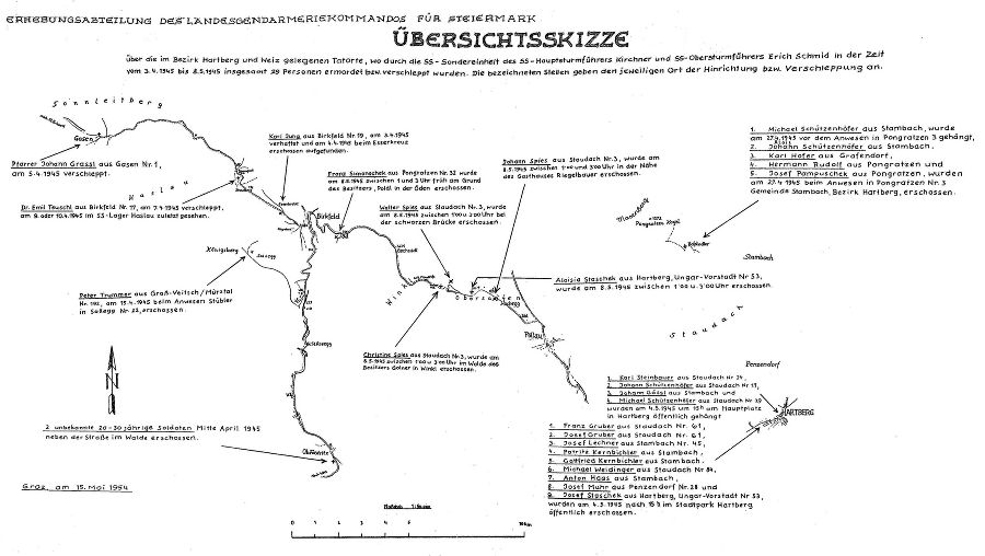 [6] Erhebungsabteilung des Landesgendarmeriekommandos für Steiermark, Übersichtsskizze über die im Bezirk Hartberg und Weiz gelegenen Tatorte, wo durch die SS-Sondereinheit des SS-Hauptsturmführers Kirchner und SS-Obersturmführers Erich Schmid in der Zeit vom 3. 4. 1945 bis 8. 5. 1945 insgesamt 29 Personen ermordet bzw. verschleppt wurden, Graz, 15. 5. 1954, DÖW (2122).