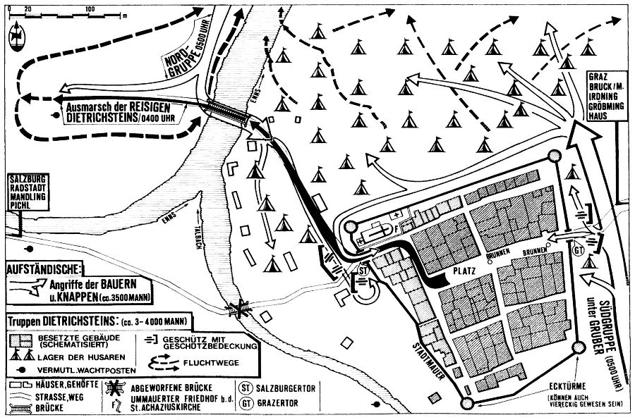 Der Bergrichter Konrad Reustl an der Spitze der Aufständischen im oberen Ennstal hatte sich zuvor mit den Knappen und Bauern über den Mandlingpass zurückgezogen,[24] denn inzwischen war Graf Niklas von Salm – der spätere Verteidiger Wiens 1529 gegen die osmanische Belagerung – als oberster Feldhauptmann der kaiserlichen Truppen mit einem weiteren Aufgebot zur Verstärkung für Dietrichstein ins Ennstal aufgebrochen.