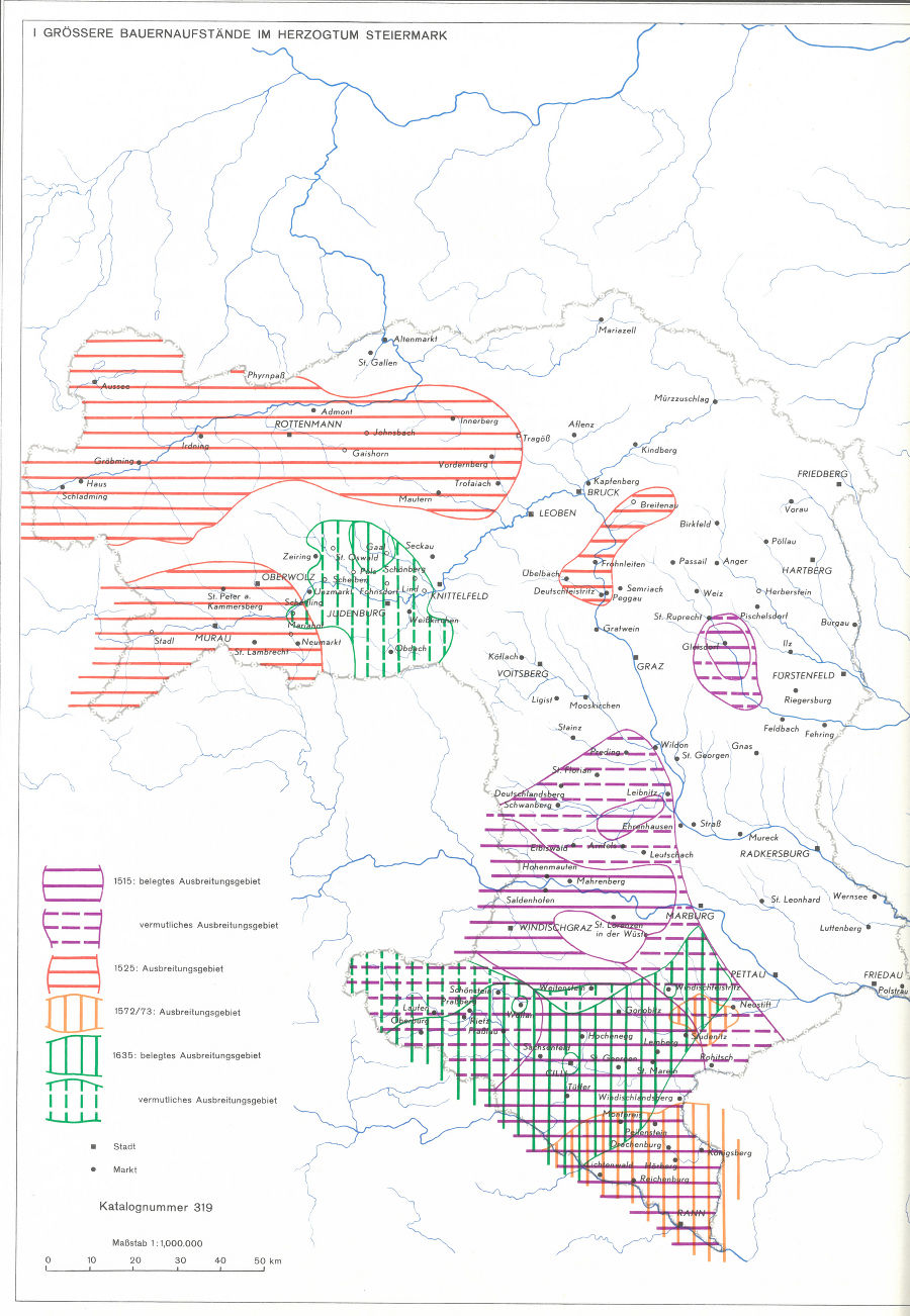 [33] Gerhard Pferschy, Die Bauernaufstände. In: Gerhard Pferschy (Red.), Der Steirische Bauer. Leistung und Schicksal von der Steinzeit bis zur Gegenwart. Katalog der Steirischen Landesausstellung 1966 (= Veröffentlichungen des Steiermärkischen Landesarchives 4, Graz 1966), 126–151 [in Folge: Pferschy, Bauernaufstände], hier 139.